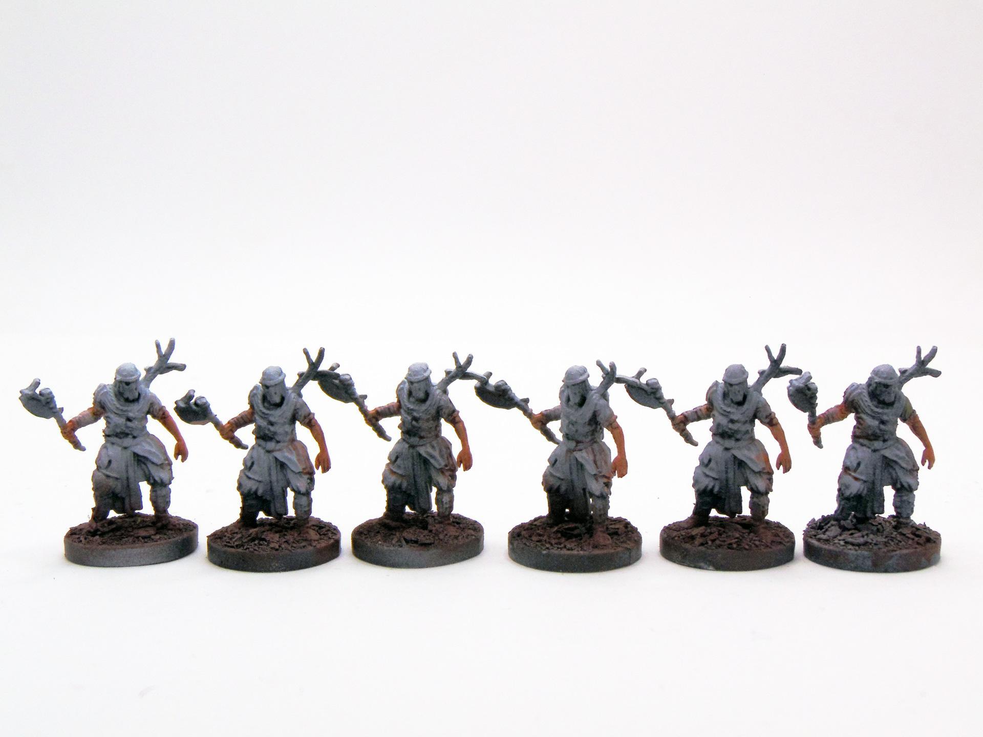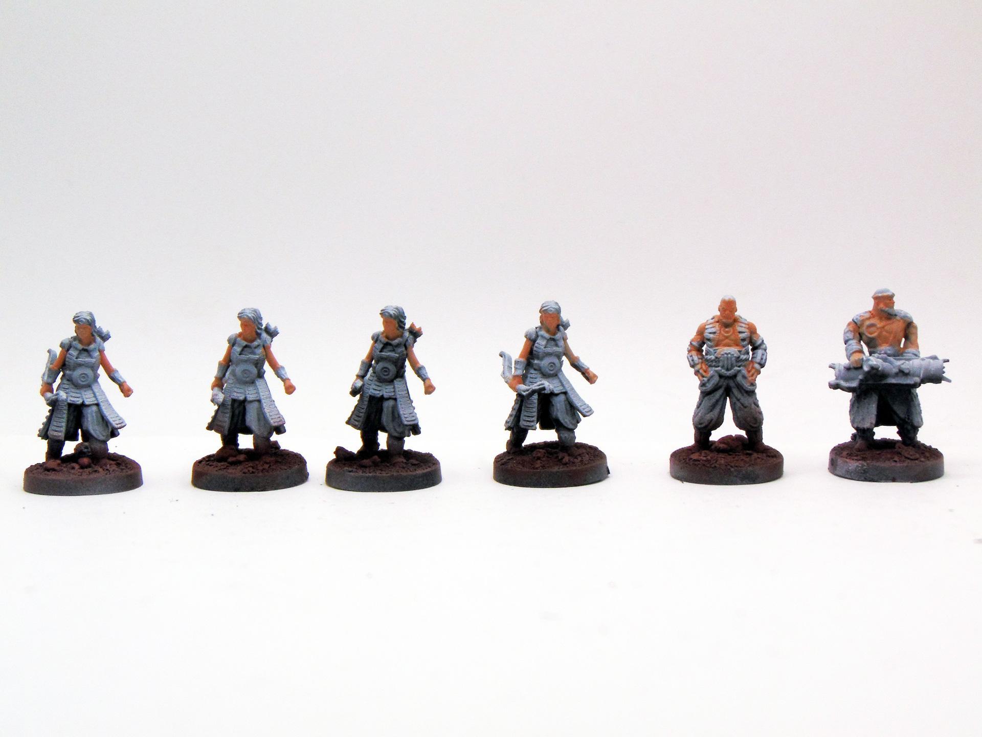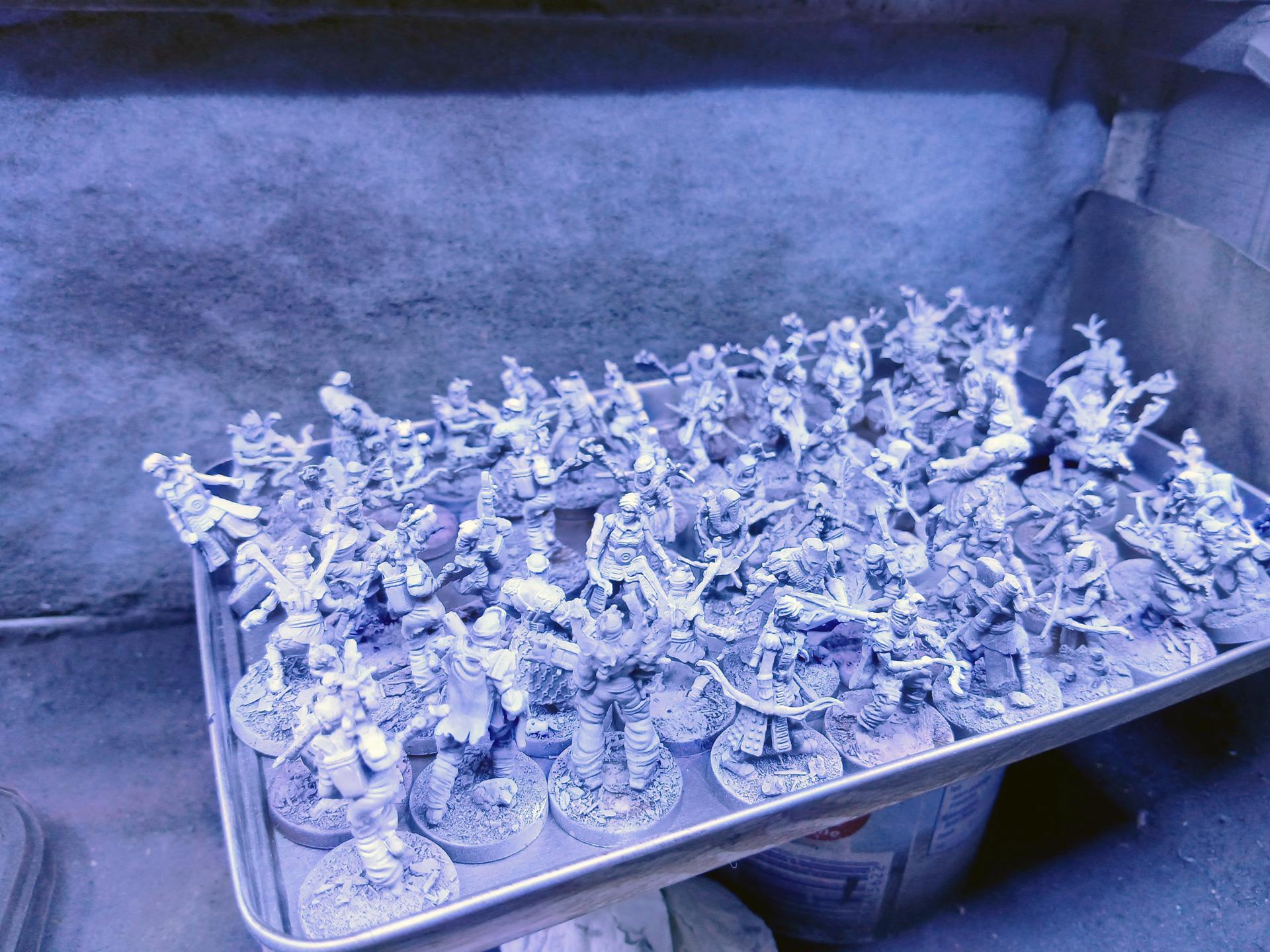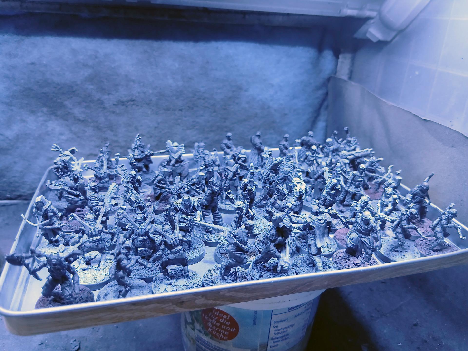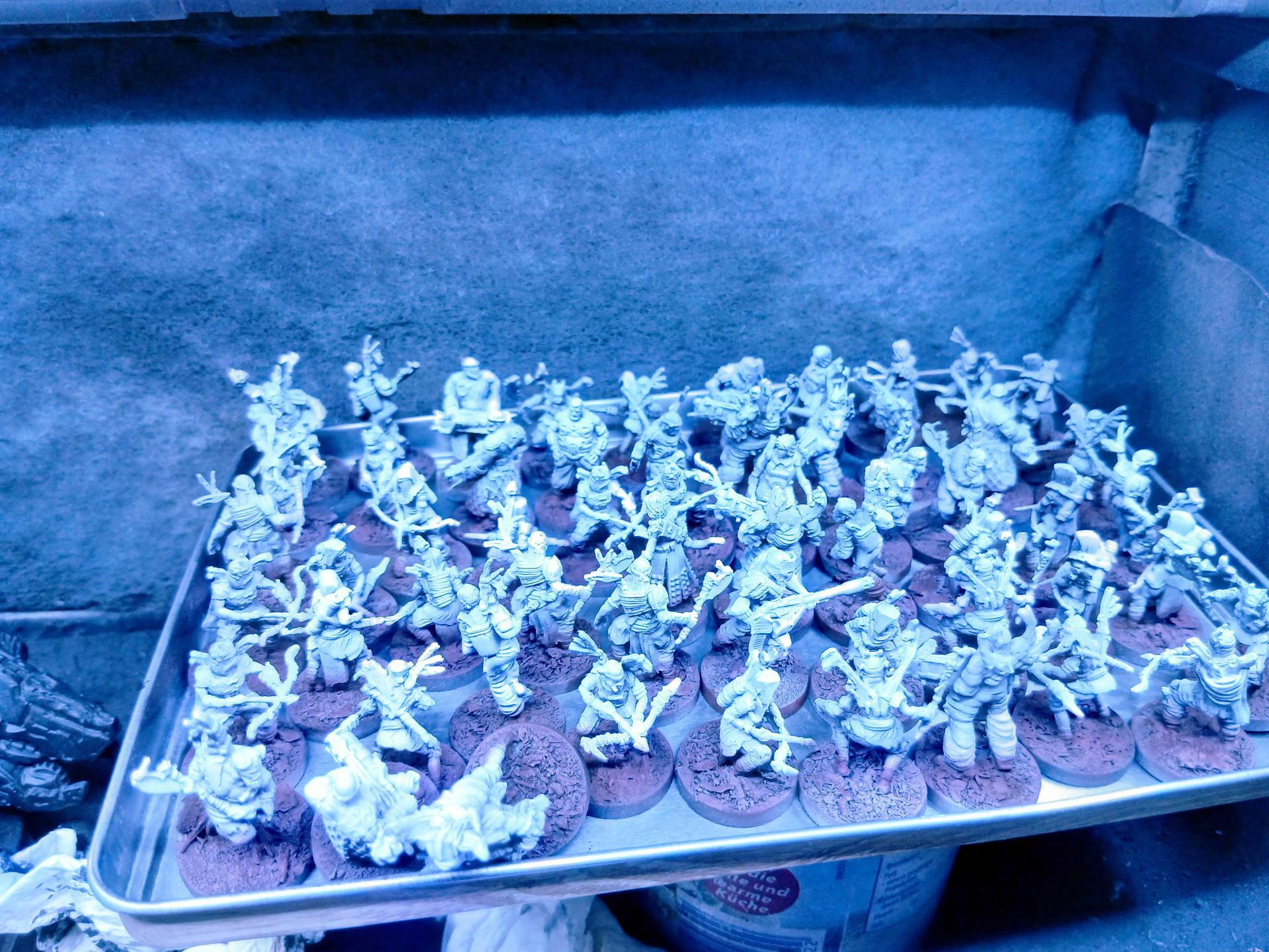 Ich grüße euch, Wir machen weiter. Gestern Abend fand noch ein kleines Basteltreffen im IKJG statt, sodass ich meine ersten Figuren beginnen konnte. Leider standen noch einige andere Angelegenheiten an, sodass bis jetzt nur sechs Modelle gestartet wurden. Derzeit sieht es so aus: Wie bereits geschrieben, ist der Plan, für sämtliche Figuren nun erst einmal die Grundfarbe des Hauttons aufzutragen. Das hat eigentlich keine besondere Bewandtnis, aber da ich genau weiß, wie sehr ich bei den Hauttönen am Ende wieder würgen werde, ist es vielleicht eine gute Idee, diese zuerst umzusetzen. Modulieren, in welche Richtung die Haut geht, können wir im Anschluss immer noch. Allerdings kann ich dann direkt mit den nächsten Grundfarben auf den verschiedenen Modellen weitermachen und zwischenzeitlich entscheiden, welche dann später mein erster Block werden ... man darf also gespannt sein! Das war's von mir für jetzt! Möge das blaue Licht euch gewogen bleiben! -