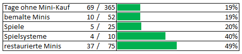 Chaoself Geschrieben am 6. Dezember 2022 Geschrieben am 6. Dezember 2022 (bearbeitet) C-11 Buy low / paint max Challenge 2023 Hier also die C -11 Variante. 2022 habe ich einmal fast 100 no buy Tage geschafft. Die Marke soll in 2023 getoppt werden. Ziel: 2022 schlagen✅ 2023: 151 Tage 01.06.2023 Sonderbudget: 180 Euro für Figuren. Rest 54 Erreichte Buy low - Ziele Aktuelle Tage ohne Figuren: 45 Tage Letzter Kauf 2× HdR am 01.06.2023 3 x HdR am 28.07.2023 Hdr Box 24.08.2023 - Bemalte Figuren in 2033 180 Low Buy Achievement: 2022 97 Tage 2023 151 Tage bearbeitet 9. Oktober 2023 von Chaoself 15 365 Figuren an 365 Tagen: 2021✅ 2022✅ 2024 ✅