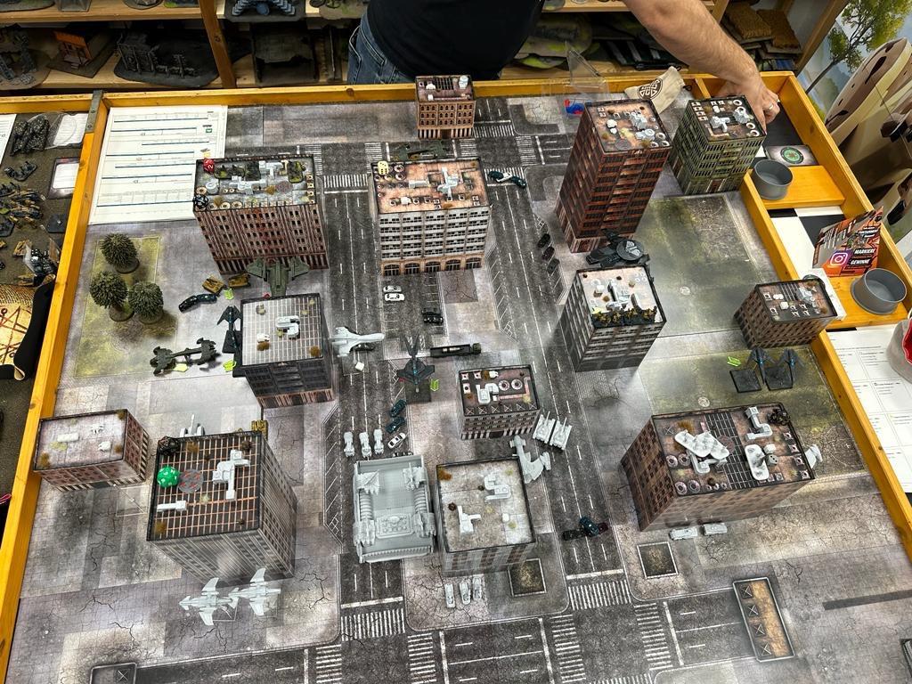 Denyo Geschrieben am 7. Oktober 2023 Autor Geschrieben am 7. Oktober 2023 (bearbeitet) Take & Extract - 1.750 Punkte - UCM vs. Resistance Prolog: Die Offiziere standen um den noch inaktiven Holotisch und unterhielten sich mit gedämpften Stimmen. Einige hielten dampfende Blechtassen mit dem eingravierten Wappen ihres Verbands, der 44th Combined Assault Brigade in den Händen. Plötzlich kam Bewegung in die Männer und Frauen, als sich die Tür leise zischend öffnete und ihr Befehlshaber, Colonel D.K. Miles mit seinem Stab die Brücke betrat. Die Gespräche erstarben und Spannung breitete sich in Erwartung der nun folgenden Befehlsausgabe aus. „Meine Damen Herren, guten Abend. Bringen wir das hier hinter uns. Morgen wird ein harter Tag.“ Der Holotisch wurde eingeschaltet und zeigte die Karte des Operationsraums. „Das hier ist Berlin. Stark urbanes Gelände, kaum Scourge Aktivitäten aber dafür mit einer starken Präsenz unserer Mehr-oder-weniger Freunde des Widerstands. Der Nachrichtendienst hat zwei äußerst unangenehme Informationen erhalten, die ein sofortiges Eingreifen erforderlich machen. Das dort,“ ein Kartenabschnitt wurde bei diesen Worten stark vergrößert, „das ist ein liegengebliebener Truck. Das Problem ist seine Ladung. Wer auch immer diesen Truck verlegt hat, lies mit ihm eine Mittelstreckenrakete und einen C-Waffengefechtskopf unbekannten Typs zurück. Unfassbar aber wohl zutreffend. Bislang hat das Baby niemand vermisst, aber er wurde gefunden und ein großer Verband der lokalen Resistance Präsenz wurde zur Bergung entsandt. Das Oberkommando möchte denen aber nicht so eine mächtige Waffe überlassen. Und deshalb ist es unsere Aufgabe die Waffe zu sichern und unsere Freunde abzuweisen. Mit allen Mitteln. In den umliegenden Gebäuden, den sekundären Missionszielen Alpha bis Delta, gibt es wohl zudem Datenwürfel zu bergen. Das ist wiederum ein klassischer Rein-und-Raus-Job für unsere Infanterie. Die schweren Einheiten sichern den Truck. Und jetzt kommt die schlechte Nachricht Nummer zwei. Der Nachrichtendienst weiß bei den lokalen Kräften um einen dieser riesigen, mobilen Laser. Wir sehen diese Maschinen zunehmend im Fronteinsatz. Die sind hart und zerstörerisch. Wird er gegen uns eingesetzt, werden wir viele gute Männer und Frauen verlieren. Sollte vor diesem Hintergrund der Truck nicht zu sichern sein, werde ich den Rückzug befehlen und die Airforce wird das Ziel zur Explosion bringen. Das ist zwar schade um Berlin, aber wir äschern lieber alles kontrolliert ein, bevor wir dieses Problem künftig immer mitbedenken müssen. Fragen? Keine? Gut, wegtreten.“ Spiel am 07.10.23 - Ausgangslage Unsere Spielergruppe ist in der Escalation League bei 1750 Punkte angelangt. Ich trete gegen @SirDaniel und seine Resistance an. Daniel ist ein super Typ, um so erstaunlicher, dass wir mit diesem Match erstmals gegeneinander spielen. Gleichzeitig ist es auch meine Premiere gegen die Resistance. Die Resistance finde ich als Fraktion und von den Modellen her einfach genial. Ich freue mich also sehr auf das Spiel. Die Spannung stieg noch einmal mehr, als Daniel mir vorab einen leichten Behemoth in Form eines Mininlasers ankündigte. Was für ein schönes Modell! Die Armeen Daniel (Resistance) Daniel bringt erwartungsgemäß 7 Battlegroups mit. Armeeliste: Spoiler 3ter Verteidigungsbezirk (Resistance) 1735pts : 1750pts Last Updated: Sun Oct 08 2023 16:57:30 GMT+0200 (Mitteleuropäische Sommerzeit) HQ Battlegroup 1 1 X Alexander Heavy Tank 135pts + CV2 Commander 35pts 1 X Hydra Relay Hovercraft 70pts + CV1 Commander 0pts Chosen Transports and Auxiliary Units: 1 X Lifthawk Dropship 45pts Frontline Battlegroup 1 2 X Resistance Fighters 50pts 2 X Resistance Fighters 50pts Chosen Transports and Auxiliary Units: 1 X Jackson APC 10pts 1 X Lifthawk Dropship 70pts + AA Cannon 25pts 1 X Jackson APC 10pts Frontline Battlegroup 2 4x Resistance Veterans 160pts + Machine Pistols 0pts Chosen Transports and Auxiliary Units: 2 X Swifthawk Tilt-Jet 60pts Armour Battlegroup 1 2 X Hannibal Tank 80pts 3 X Repair Technical 30pts 6 X Rocket Technical 60pts Chosen Transports and Auxiliary Units: 1 X Lifthawk Dropship 70pts + AA Cannon 25pts 1 X 109 Splitting Drill 45pts Armour Battlegroup 2 3 X AA Gun Wagon 75pts 3 X AA Gun Wagon 75pts 1 X Thunderstorm Heavy Hovercraft 200pts Chosen Transports and Auxiliary Units: 1 X Tempest Interceptor 70pts Vanguard Battlegroup 1 1 X EAA Columbus Battlewalker 70pts + Heavy Flamethrower 0pts War Engine Battlegroup 1 1 X Avernus Mining Engine 300pts Auxiliary Group 1 X Lifthawk Dropship 45pts 2 X Jackson APC 20pts 2 X Lifthawk Dropship 140pts + AA Cannon 50pts 1 X 109 Splitting Drill 45pts 1 X Tempest Interceptor 70pts 2 X Swifthawk Tilt-Jet 60pts Denyo (UCM) Und ich habe auch 7 Battlegroups: Armeeliste: Spoiler 44th Combined Assault Brigade UCM 1750pts : 1750pts Last Updated: Sun Oct 08 2023 18:44:33 GMT+0200 (Mitteleuropäische Sommerzeit) HQ Battlegroup 1 1 X Phoenix Command Gunship 285pts + CV4 Commander 95pts Chosen Transports and Auxiliary Units: 2 X Archangel Interceptor 90pts 2 X Archangel Tactical Bomber 100pts 1 X Seraphim Bomber 90pts Frontline Battlegroup 1 3 X Legionnaires 60pts 3 X Legionnaires 60pts Chosen Transports and Auxiliary Units: 1 X Bear APC 15pts 1 X Bear APC 15pts 1 X Condor Dropship 30pts Frontline Battlegroup 2 2 X Praetorian Spec-Ops 80pts Chosen Transports and Auxiliary Units: 1 X Raven Light Troopship 25pts Armour Battlegroup 1 3 X Sabre Tank 105pts 2 X Broadsword Super Heavy Tank 170pts Chosen Transports and Auxiliary Units: 1 X Albatross Heavy Dropship 60pts Armour Battlegroup 2 3 X Rapier AA Tank 120pts 3 X Katana Light Tank 105pts + Flamethrower 0pts Chosen Transports and Auxiliary Units: 1 X Condor Dropship 30pts 1 X Condor Dropship 30pts Vanguard Battlegroup 1 1 X Buzzard Aerial Target Craft 70pts + AA Battery 10pts 2 X Hazard Suits 70pts Vanguard Battlegroup 2 2 X EAA Columbus Battlewalker 140pts + Heavy Flamethrower 0