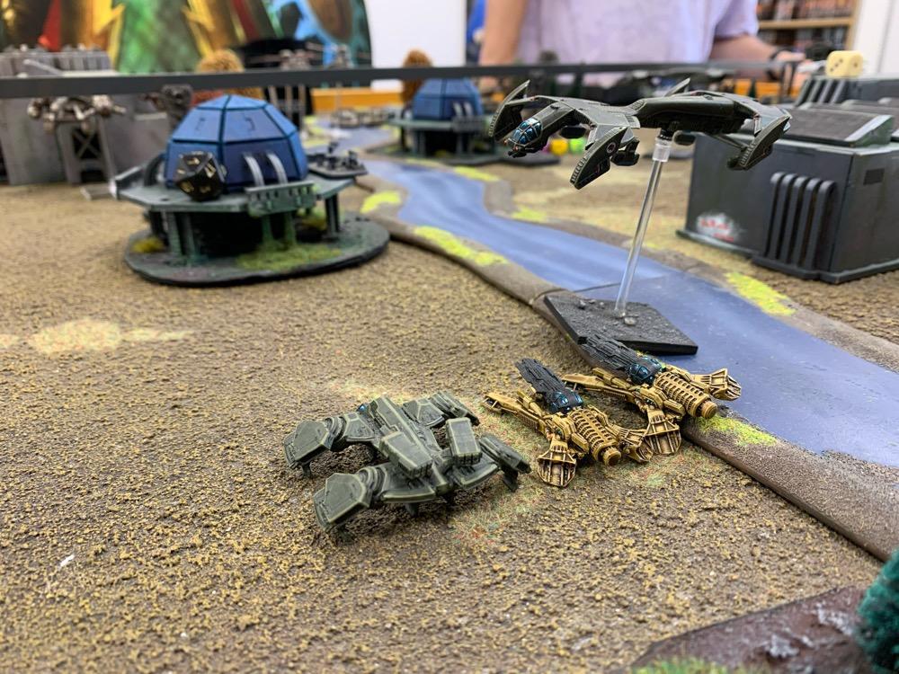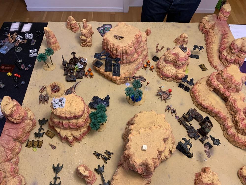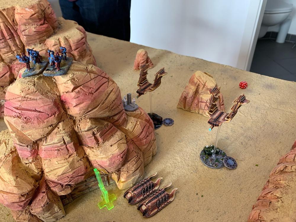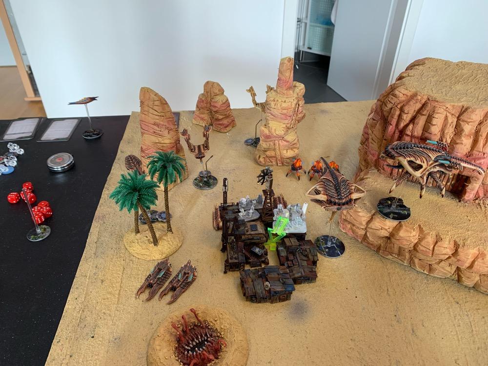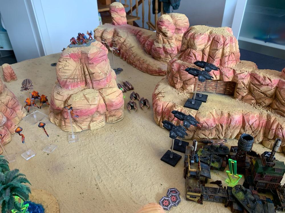 Denyo Geschrieben am 9. November 2023 Autor Geschrieben am 9. November 2023 (bearbeitet) Take & Extract - 1.750 Punkte - UCM vs. The Scourge Prolog Quelle Die Sonne brannte wieder einmal unbarmherzig auf das Wellblechdach des Rusty Inn, sodass Willie das Material leiste knacken hören konnte. Das und die endlosen Fliegen, die, vom Gestank der kleinen Siedlung angezogen, überall herumschwirrten. Ein neuer Tag, der gleiche Trott … Langeweile. Ausgerechnet New Hope hieß das Kaff. Dabei war hier alle Hoffnung auf Besserung oder auf ein Happy End vergebens. „Dämlicher Name“ dachte Willie, seinen Sheriffstern zurecht rückend, als er zum Türgriff der einzigen Kneipe weit und breit, das besagte Rusty Inn, griff. Quelle Plötzlich aber, war etwas anders. Ein Wind kam auf und sogar die lästigen Fliegen verstummten. Ein seltsames Sirren lag in der Luft. „Was zum Henker ist denn das?“ fragte Willie ohne jemanden bestimmtes anzusprechen. Am Horizont konnte er etwas großes, Unbekanntes wahrnehmen. Aber was konnte es sein? „Verdamm mich! Die Scourge! Hier?!“ Er rannte los in Richtung seines Büros, um … ja, um was eigentlich zu tun? Da hörte er noch ein Geräusch, diesmal das Heulen von Turbinen und vier nachtschwarze Maschinen donnerten im Tiefflug über New Hope und die Wüste hinweg. „Bravo 1 an Basis, kommen“ - „Basis hört!“ „Feind gesichtet bei unserer Position. Truppenbewegung in Bataillonsstärke. Kehren um. Ende“ Auf dem Landungsschiff Cherub im Orbit über dem Wüstengebiet heulten Sirenen auf, und Mensch wie Material wurden in aller Eile in die für sie bereitstehenden Transporter verladen. Auf diese Gelegenheit hatte die 44th Combined Assault Brigade lange gewartet. Endlich war der Feind aufgespürt worden. Das Gelände war zwar sehr zerklüftet, sodass die UCM Truppen ihre überlegene Feuerkraft nicht voll entfesseln können würden. Aber diesen marodierenden, auf Las Vegas zu rückenden Scourge Verband galt es um jeden Preis aufzuhalten und so viele Menschen in diesem Sektor in Sicherheit zu bringen wie möglich. Das Szenario Am Samstag spielte ich das obige Szenario erneut, diesmal aber gegen die Scourge von @Aun Jan Kauyon und auf der schicken Wüstenplatte von @Nuc. Die Armeelisten: UCM Ich habe die Liste mal abgewandelt, weil ich neues Spielzeug in Form von Scimitar Tanks und Polecat Buggies ausprobieren wollte. Hier die Liste: Spoiler 44th Combined Assault Brigade UCM 1750pts : 1750pts HQ Battlegroup 1 1 X Phoenix Command Gunship 285pts + CV4 Commander 95pts Chosen Transports and Auxiliary Units: 2 X Archangel Interceptor 90pts 2 X Archangel Tactical Bomber 100pts 1 X Seraphim Bomber 90pts Frontline Battlegroup 1 3 X Legionnaires 60pts 2 X Praetorian Spec-Ops 80pts Chosen Transports and Auxiliary Units: 1 X Bear APC 15pts 1 X Condor Dropship 30pts 1 X Raven Light Troopship 25pts Frontline Battlegroup 2 3 X Legionnaires 60pts Chosen Transports and Auxiliary Units: 1 X Bear APC 15pts 1 X Condor Dropship 30pts Armour Battlegroup 1 2 X Scimitar Heavy Tank 100pts 3 X Katana Light Tank 105pts + Flamethrower 0pts Chosen Transports and Auxiliary Units: 1 X Condor Dropship 30pts 1 X Condor Dropship 30pts Armour Battlegroup 2 4 X Polecat Buggy 100pts Chosen Transports and Auxiliary Units: 1 X Vulture Dropship 35pts + AA Battery 10pts Vanguard Battlegroup 1 1 X Buzzard Aerial Target Craft 70pts + AA Battery 10pts 2 X Hazard Suits 70pts 2X Falcon Light Gunship 90pts + AP Multi-Missile 5pts + AA Multi-Missile 5pts Vanguard Battlegroup 2 3 X Rapier AA Tank 120pts 2X Falcon Light Gunship 90pts + AP Multi-Missile 5pts + AA Multi-Missile 5pts Chosen Transports and Auxiliary Units: 1 X Condor Dropship 30pts Auxiliary Group 2 X Bear APC 30pts 5 X Condor Dropship 150pts 1 X Vulture Dropship 35pts + AA Battery 10pts 2 X Archangel Interceptor 90pts 2 X Archangel Tactical Bomber 100pts 1 X Seraphim Bomber 90pts 1 X Raven Light Troopship 25pts The Scourge Armeeliste: Spoiler Scourge 1745pts : 1750pts HQ Battlegroup 1 1 X Oppressor Command Arthropod 215pts + CV3 Commander 65pts Chosen Transports and Auxiliary Units: 1 X Harbinger Dropship 45pts Frontline Battlegroup 1 2 X Warriors 50pts 2 X Demolisher Shock Troops 90pts Chosen Transports and Auxiliary Units: 1 X Invader APC 15pts 1 X Invader APC 15pts 1 X Marauder Dropship 40pts Frontline Battlegroup 2 2 X Warriors 50pts 2 X Demolisher Shock Troops 90pts Chosen Transports and Auxiliary Units: 1 X Invader APC 15pts 1 X Invader APC 15pts 1 X Marauder Dropship 40pts Armour Battlegroup 1 3 X Hunter Tank 105pts 2 X Slayer Heavy Tank 130pts Chosen Transports and Auxiliary Units: 1 X Marauder Dropship 40pts 1 X Marauder Dropship 40pts Armour Battlegroup 2 4 X Spectre Skimtank 80pts Chosen Transports and Auxiliary Units: 1 X Harbinger Troopship 50pts Vanguard Battlegroup 1 3 X Ravager AA Beetle 120pts 2 X Eviscerator Assault Troops 100pts 4 X Emeritus Incendiary Drone 40pts Chosen Transports and Auxiliary Units: 1 X Intruder Light Troopship 35pts 1 X Intruder Light Dropship 20pts Vanguard Battlegroup 2 3 X Ravager AA Beetle 120pts 2 X Eviscerator Assault Troops 100pts Chosen Transports and Auxiliary Units: 1 X Corsair Interceptor 50pts + Arc Caster 10pts 1 X Intruder Light Troopship 35pts Auxiliary Group 1 X Harbinger Dropship 45pts 4 X Invader APC 60pts 4 X Marauder Dropship 160pts 1 X Harbinger Troopship 50pts 2 X Intruder Light Troopship 70pts 1 X Intruder Light Dropship 20pts 1 X Corsair Interceptor 50pts + Arc Caster 10pts Der Plan der UCM Schnell die beiden, meiner Spielfeldkante nahen Missionsziele schnappen und abhauen. Das ganze mit einem defensiven Ansatz möglichst gut abdecken und die gegnerischen Transporter und Infanterie mit den fliegenden Einheiten und den Flammenwerfern penetrieren und in den Garnisonen festzusetzen, um eine Evakuierung der sekundären Missionsziele zu vermeiden. Das mittlere Missionsziel ignorieren und in der letzten Runde, mit der letzten Aktivierung die vier schnellen Polecatbuggies in die 6“