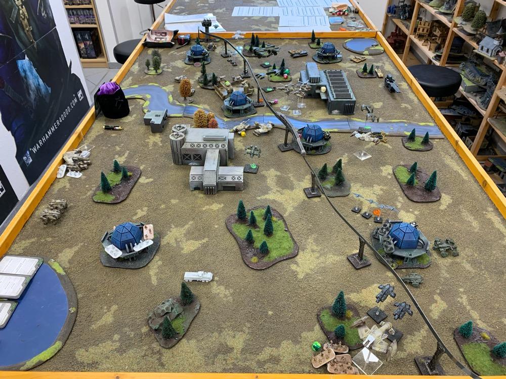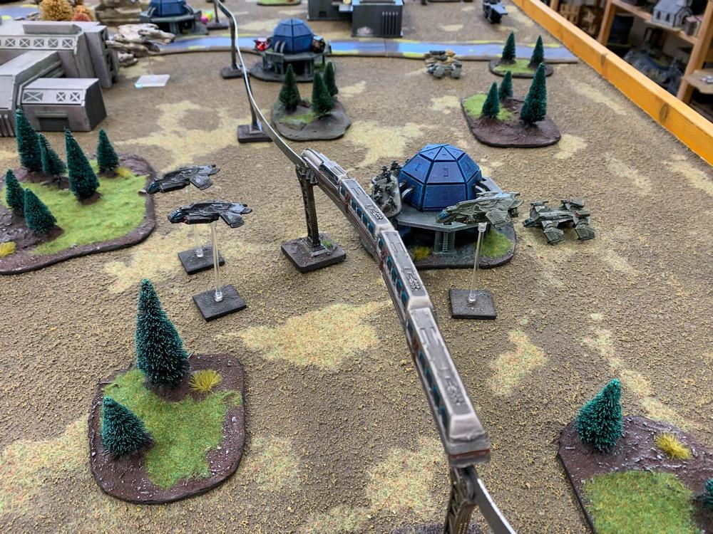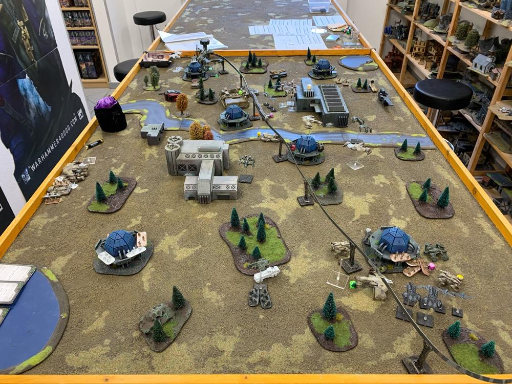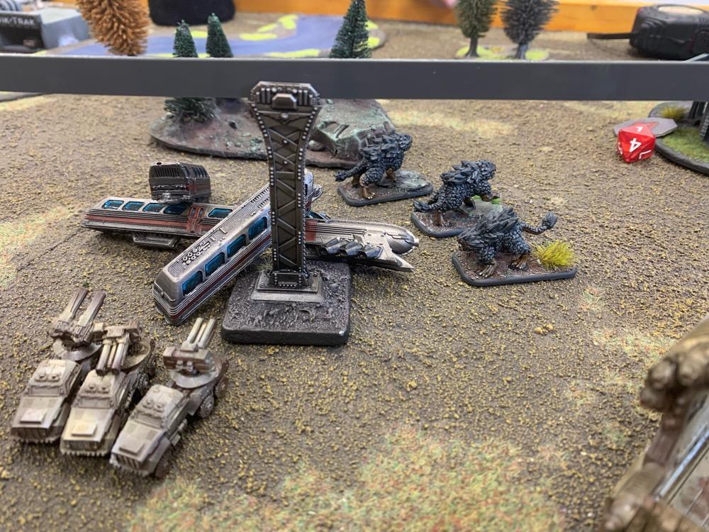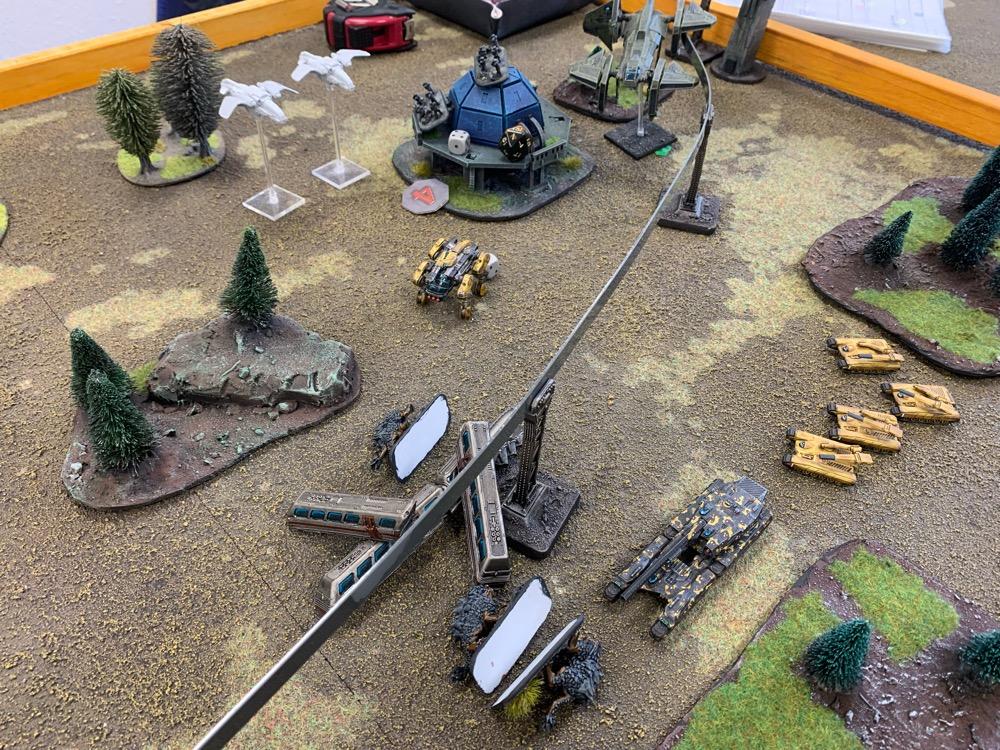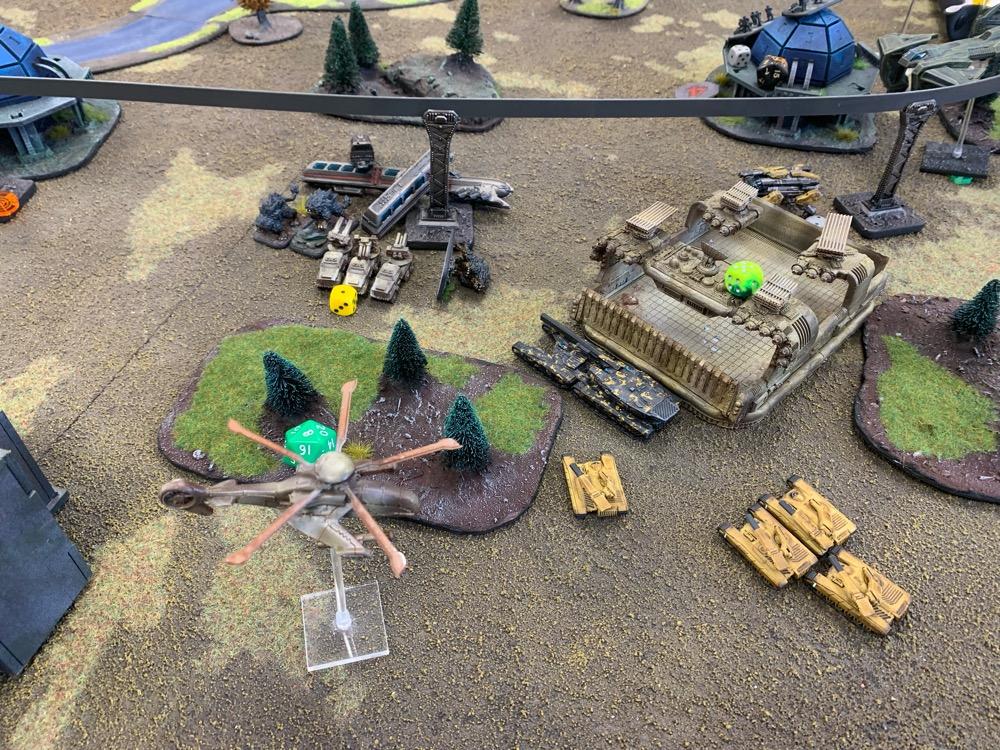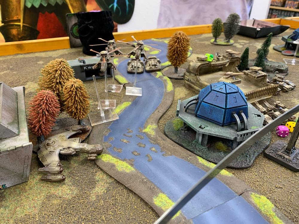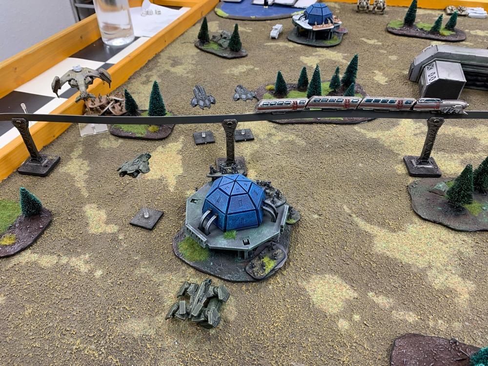 Denyo Geschrieben am 14. September 2024 Autor Geschrieben am 14. September 2024 (bearbeitet) Precious Metals or "Ooops! Those weren't rocks..." Resistance vs UCM 1.750 Pts. Prolog Generalleutnant Auclair schenkte sich gerade eine Tasse heißen Kaffee ein, als sein Adjutant Major Urimov das Büro betrat, "General! Mit Verlaub, diese Meldung müssen sie sehen! Der Widerstand schmuggelt in 12 Stunden waffenfähiges Uran in einem zivilen Zug durch unseren Sektor. Ein Agent konnte den Zug noch mit einem Sender markieren, sodass wir ihn abfangen können." Auclair nickte stumm, nachdem er einen Schluck seines Kaffees genommen hatte. "Danke Major, zeigen Sie mal her. Bei Gott, dieses Resistance Jungs in Neu-Berlin geht mir gehörig auf den Sack. Wir sind hier um Aliens zu töten, nicht um denen ständig auf die Finger hauen zu müssen." Er las den Bericht aufmerksam durch. "In Ordnung Major, versetzen Sie die Brigade in Bereitschaft und beauftragen Sie den Stab mit der Erarbeitung eines Angriffsplans. In zwei Stunden will ich die Ergebnisse vorgelegt bekommen und dann geht's los." Urimov salutierte "Jawohl, Herr General!" Die Mission Die Armeen UCM Spoiler UCM 1750pts : 1750pts HQ Battlegroup 1 1 X Ferrum Drone Base 220pts + CV3 Commander 65pts 1 X Starsprite Drones 1 X Kodiak Command ACV 125pts + CV1 Commander 0pts Frontline Battlegroup 1 3 X Legionnaires 60pts 2 X Praetorian Spec-Ops 80pts Chosen Transports and Auxiliary Units: 1 X Vulture Troopship 35pts 1 X Raven Light Troopship 25pts Frontline Battlegroup 2 3 X Legionnaires 60pts 2 X Praetorian Spec-Ops 80pts Chosen Transports and Auxiliary Units: 1 X Raven Light Troopship 25pts 1 X Vulture Troopship 35pts Armour Battlegroup 1 3 X Sabre Tank 105pts 1 X Broadsword Super Heavy Tank 85pts + Demolition Cannon 0pts + Tremor Rotary Cannon 0pts Chosen Transports and Auxiliary Units: 1 X Condor Dropship 30pts 1 X Condor Dropship 30pts Armour Battlegroup 2 3 X Sabre Tank 105pts 1 X Broadsword Super Heavy Tank 85pts 3 X Rapier AA Tank 120pts Chosen Transports and Auxiliary Units: 1 X Albatross Heavy Dropship 60pts Vanguard Battlegroup 1 2 X Praetorian Sniper Team 70pts 2 X Crossbow Laser Artillery 50pts Chosen Transports and Auxiliary Units: 1 X Vulture Dropship 35pts + AA Battery 10pts Vanguard Battlegroup 2 2 X EAA Columbus Battlewalker 140pts 2 X Falcon Light Gunship 90pts + AP Multi-Missile 5pts + AA Multi-Missile 5pts Auxiliary Group 2 X Vulture Troopship 70pts 2 X Raven Light Troopship 50pts 2 X Condor Dropship 60pts 1 X Albatross Heavy Dropship 60pts 1 X Vulture Dropship 35pts + AA Battery 10pts Resistance Spoiler Untitled Army Resistance 1750pts : 1750pts Last Updated: Sat Sep 14 2024 14:02:14 GMT+0200 (Mitteleuropäische Sommerzeit) HQ Battlegroup 1 1 X Alexander Heavy Tank 135pts + CV2 Commander 35pts Chosen Transports and Auxiliary Units: 1 X Lifthawk Dropship 60pts + AA Cannon 25pts Frontline Battlegroup 1 3 X Resistance Fighters 75pts 3 X Resistance Fighters 75pts 4 X Resistance Fighters 100pts Chosen Transports and Auxiliary Units: 1 X Lifthawk Troopship 55pts + Flamethrower 10pts 1 X Battle Bus 25pts + Rocket Launcher Battery 10pts Frontline Battlegroup 2 2 X Resistance Veterans 80pts + Plasma Rifles 0pts 2 X Resistance Veterans 80pts + Plasma Rifles 0pts Chosen Transports and Auxiliary Units: 1 X Swifthawk Tilt-Jet 35pts 1 X Swifthawk Tilt-Jet 35pts Armour Battlegroup 1 2 X Hannibal Tank 80pts Chosen Transports and Auxiliary Units: 1 X Lifthawk Dropship 35pts Armour Battlegroup 2 2 X Circe Attack Hovercraft 140pts 6 X AA Gun Wagon 150pts 1 X Thunderstorm Heavy Hovercraft 190pts Chosen Transports and Auxiliary Units: Vanguard Battlegroup 1 1 X EAA Columbus Battlewalker 70pts 4 X Cyclone Attack Copter 260pts + Tornado Missiles 5pts 1 X EAA Columbus Battlewalker 70pts Chosen Transports and Auxiliary Units: Auxiliary Group 1 X Lifthawk Dropship 60pts + AA Cannon 25pts 1 X Lifthawk Troopship 55pts + Flamethrower 10pts 1 X Battle Bus 25pts + Rocket Launcher Battery 10pts 2 X Swifthawk Tilt-Jet 70pts 1 X Lifthawk Dropship 35pts Das Schlachtfeld Gespielt wurde auf eine Fläche von 120x180cm. Der Zug mit der zu bergenden Ladung durchquert das Feld von links nach rechts, am Ende jeder Runde 12“ weit. Die Hochtrasse blockiert Fliegern die Sichtlinie. Um die Ladung des Zugs zu bergen, müssen zwei nebeneinanderliegende Stützpfeiler zum Einsturz gebracht werden. Durchquert der Zug anschließend diese Passage, entgleist er. Das Feld wird zusätzlich durch einen Fluss geteilt. Flieger und Skimmer (schwebende Einheiten) können ihn überqueren, fahrende Einheiten müssen dazu eine der beiden Furten nutzen, oder von ihrem fliegenden Transporter übergesetzt werden. Die 4 äußeren Sphären beinhalten Labore, die es zu sichern gilt (je ein SP). Die Wälder können durch Infanterie besetzt werden und blockieren für nicht fliegende Einheiten die Sichtlinie. @SirDaniel spielt die Resistance und wählt die Rolle des Verteidigers. Seine Truppen werde also alle bis zu 12 Zoll weit auf dem Feld platziert. Dabei besetzt seine Infanterie die zwei Sphären in seiner Spielfeldhälfte. Die Panzer, ein großer Angriffstrupp Infanterie und die Hovercrafts rücken (z.T. in ihren fliegenden Transportern) vor. Ich greife an und fliege alle Einheiten ein. Die Drone Base und der Orbitalschläge anfordernde Kodiak verstecken sich hinter einer Fabrik, meine Panzer verlagern komplett auf rechts, um sich nicht mit dem Alexander Panzer (sein HQ) anlegen zu müssen und weil ich antizipiere, dass der Zug wohl erst auf dieser Seite des Flusses herunterkommen wird. Also brauche ich da die meisten Einheiten. Meine Sniper haben sich dank ihrer Sonderregel „Infiltrieren“ bereits zu Spielbeginn in der zentralen Sphäre platziert und dirigieren von dort die Orbitalschläge des Kodiaks. Meine Laserartillerie deckt den Fluss ab. In Runde zwei besetzen meine Special Forces einen Turm neben einer von Daniel besetzten Sphäre und fordern aus dem Orbit Columbus Walker mit schweren F