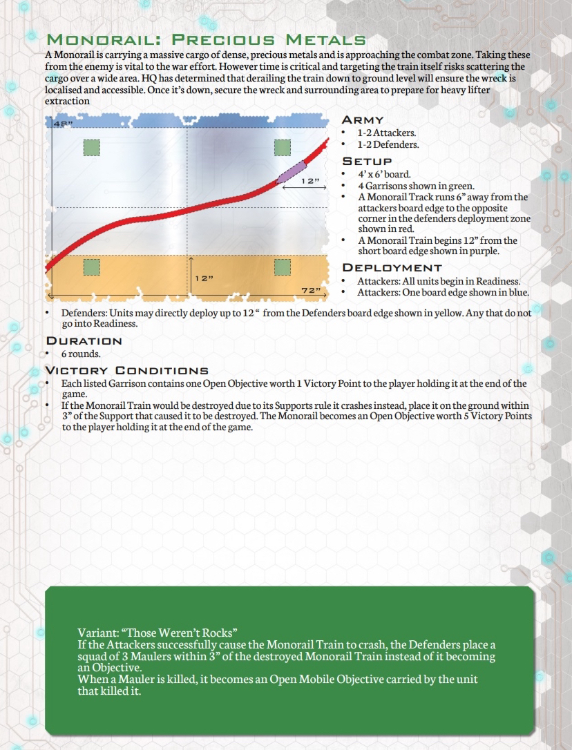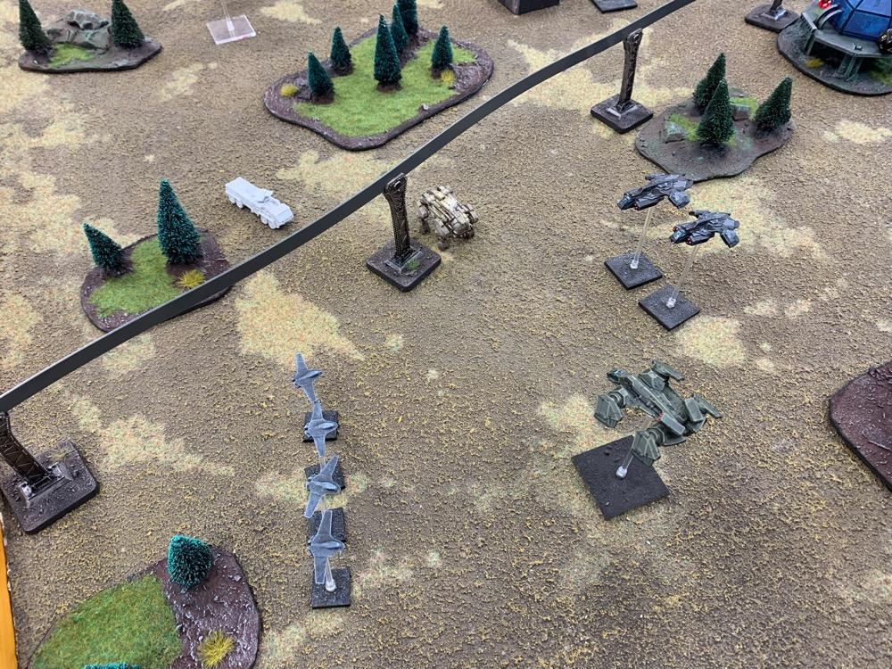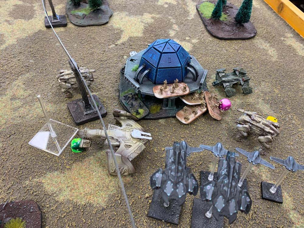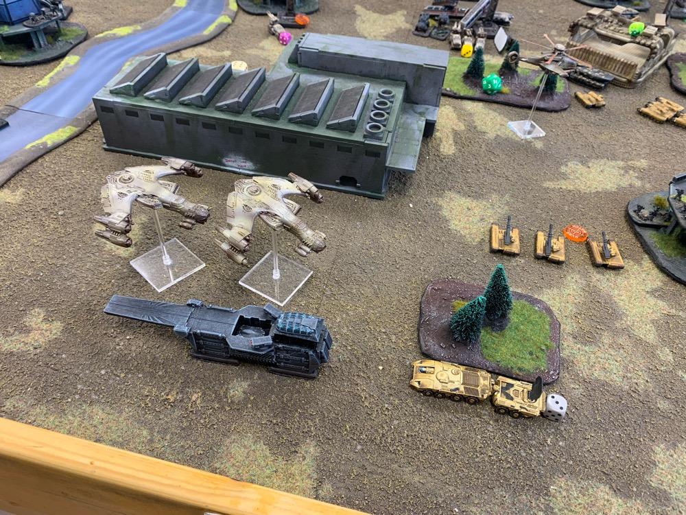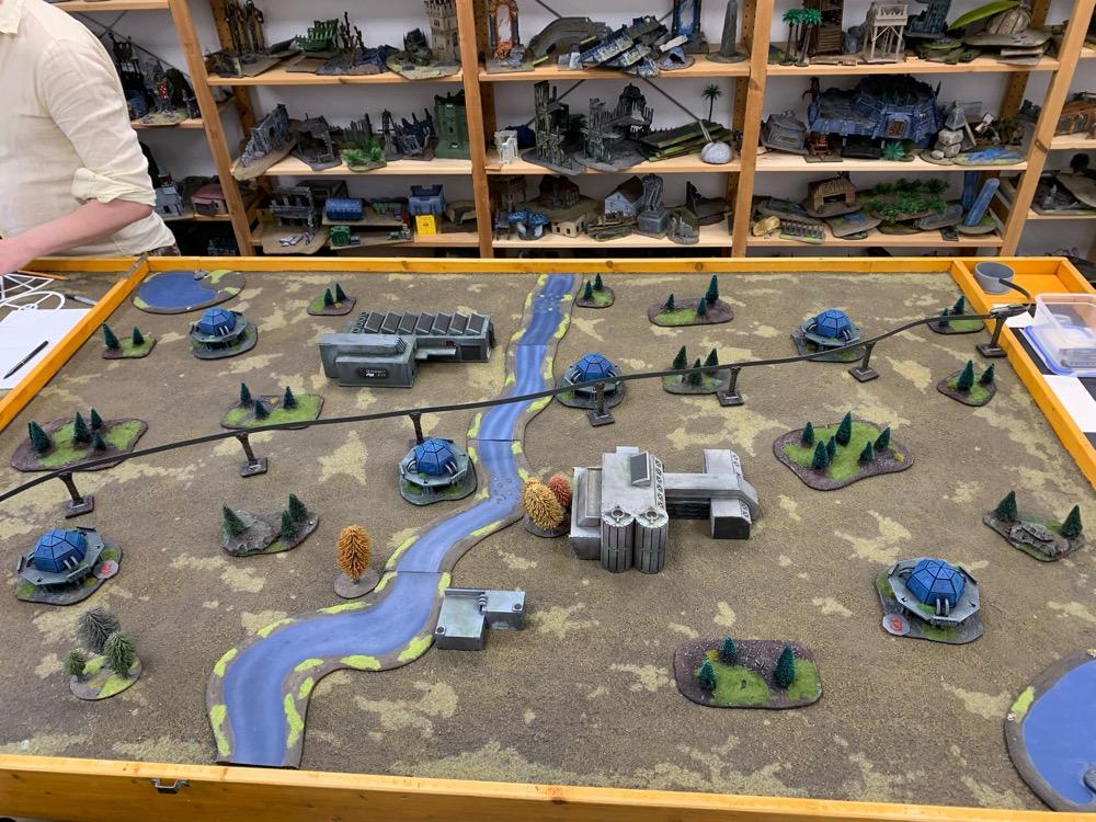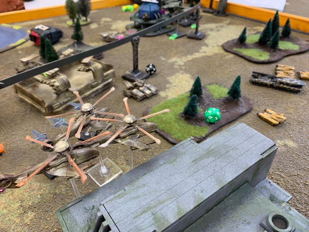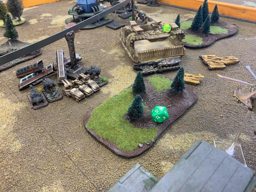 Denyo Geschrieben am 14. September 2024 Autor Geschrieben am 14. September 2024 (bearbeitet) Precious Metals or "Ooops! Those weren't rocks..." Resistance vs UCM 1.750 Pts. Prolog Generalleutnant Auclair schenkte sich gerade eine Tasse heißen Kaffee ein, als sein Adjutant Major Urimov das Büro betrat, "General! Mit Verlaub, diese Meldung müssen sie sehen! Der Widerstand schmuggelt in 12 Stunden waffenfähiges Uran in einem zivilen Zug durch unseren Sektor. Ein Agent konnte den Zug noch mit einem Sender markieren, sodass wir ihn abfangen können." Auclair nickte stumm, nachdem er einen Schluck seines Kaffees genommen hatte. "Danke Major, zeigen Sie mal her. Bei Gott, dieses Resistance Jungs in Neu-Berlin geht mir gehörig auf den Sack. Wir sind hier um Aliens zu töten, nicht um denen ständig auf die Finger hauen zu müssen." Er las den Bericht aufmerksam durch. "In Ordnung Major, versetzen Sie die Brigade in Bereitschaft und beauftragen Sie den Stab mit der Erarbeitung eines Angriffsplans. In zwei Stunden will ich die Ergebnisse vorgelegt bekommen und dann geht's los." Urimov salutierte "Jawohl, Herr General!" Die Mission Die Armeen UCM Spoiler UCM 1750pts : 1750pts HQ Battlegroup 1 1 X Ferrum Drone Base 220pts + CV3 Commander 65pts 1 X Starsprite Drones 1 X Kodiak Command ACV 125pts + CV1 Commander 0pts Frontline Battlegroup 1 3 X Legionnaires 60pts 2 X Praetorian Spec-Ops 80pts Chosen Transports and Auxiliary Units: 1 X Vulture Troopship 35pts 1 X Raven Light Troopship 25pts Frontline Battlegroup 2 3 X Legionnaires 60pts 2 X Praetorian Spec-Ops 80pts Chosen Transports and Auxiliary Units: 1 X Raven Light Troopship 25pts 1 X Vulture Troopship 35pts Armour Battlegroup 1 3 X Sabre Tank 105pts 1 X Broadsword Super Heavy Tank 85pts + Demolition Cannon 0pts + Tremor Rotary Cannon 0pts Chosen Transports and Auxiliary Units: 1 X Condor Dropship 30pts 1 X Condor Dropship 30pts Armour Battlegroup 2 3 X Sabre Tank 105pts 1 X Broadsword Super Heavy Tank 85pts 3 X Rapier AA Tank 120pts Chosen Transports and Auxiliary Units: 1 X Albatross Heavy Dropship 60pts Vanguard Battlegroup 1 2 X Praetorian Sniper Team 70pts 2 X Crossbow Laser Artillery 50pts Chosen Transports and Auxiliary Units: 1 X Vulture Dropship 35pts + AA Battery 10pts Vanguard Battlegroup 2 2 X EAA Columbus Battlewalker 140pts 2 X Falcon Light Gunship 90pts + AP Multi-Missile 5pts + AA Multi-Missile 5pts Auxiliary Group 2 X Vulture Troopship 70pts 2 X Raven Light Troopship 50pts 2 X Condor Dropship 60pts 1 X Albatross Heavy Dropship 60pts 1 X Vulture Dropship 35pts + AA Battery 10pts Resistance Spoiler Untitled Army Resistance 1750pts : 1750pts Last Updated: Sat Sep 14 2024 14:02:14 GMT+0200 (Mitteleuropäische Sommerzeit) HQ Battlegroup 1 1 X Alexander Heavy Tank 135pts + CV2 Commander 35pts Chosen Transports and Auxiliary Units: 1 X Lifthawk Dropship 60pts + AA Cannon 25pts Frontline Battlegroup 1 3 X Resistance Fighters 75pts 3 X Resistance Fighters 75pts 4 X Resistance Fighters 100pts Chosen Transports and Auxiliary Units: 1 X Lifthawk Troopship 55pts + Flamethrower 10pts 1 X Battle Bus 25pts + Rocket Launcher Battery 10pts Frontline Battlegroup 2 2 X Resistance Veterans 80pts + Plasma Rifles 0pts 2 X Resistance Veterans 80pts + Plasma Rifles 0pts Chosen Transports and Auxiliary Units: 1 X Swifthawk Tilt-Jet 35pts 1 X Swifthawk Tilt-Jet 35pts Armour Battlegroup 1 2 X Hannibal Tank 80pts Chosen Transports and Auxiliary Units: 1 X Lifthawk Dropship 35pts Armour Battlegroup 2 2 X Circe Attack Hovercraft 140pts 6 X AA Gun Wagon 150pts 1 X Thunderstorm Heavy Hovercraft 190pts Chosen Transports and Auxiliary Units: Vanguard Battlegroup 1 1 X EAA Columbus Battlewalker 70pts 4 X Cyclone Attack Copter 260pts + Tornado Missiles 5pts 1 X EAA Columbus Battlewalker 70pts Chosen Transports and Auxiliary Units: Auxiliary Group 1 X Lifthawk Dropship 60pts + AA Cannon 25pts 1 X Lifthawk Troopship 55pts + Flamethrower 10pts 1 X Battle Bus 25pts + Rocket Launcher Battery 10pts 2 X Swifthawk Tilt-Jet 70pts 1 X Lifthawk Dropship 35pts Das Schlachtfeld Gespielt wurde auf eine Fläche von 120x180cm. Der Zug mit der zu bergenden Ladung durchquert das Feld von links nach rechts, am Ende jeder Runde 12“ weit. Die Hochtrasse blockiert Fliegern die Sichtlinie. Um die Ladung des Zugs zu bergen, müssen zwei nebeneinanderliegende Stützpfeiler zum Einsturz gebracht werden. Durchquert der Zug anschließend diese Passage, entgleist er. Das Feld wird zusätzlich durch einen Fluss geteilt. Flieger und Skimmer (schwebende Einheiten) können ihn überqueren, fahrende Einheiten müssen dazu eine der beiden Furten nutzen, oder von ihrem fliegenden Transporter übergesetzt werden. Die 4 äußeren Sphären beinhalten Labore, die es zu sichern gilt (je ein SP). Die Wälder können durch Infanterie besetzt werden und blockieren für nicht fliegende Einheiten die Sichtlinie. @SirDaniel spielt die Resistance und wählt die Rolle des Verteidigers. Seine Truppen werde also alle bis zu 12 Zoll weit auf dem Feld platziert. Dabei besetzt seine Infanterie die zwei Sphären in seiner Spielfeldhälfte. Die Panzer, ein großer Angriffstrupp Infanterie und die Hovercrafts rücken (z.T. in ihren fliegenden Transportern) vor. Ich greife an und fliege alle Einheiten ein. Die Drone Base und der Orbitalschläge anfordernde Kodiak verstecken sich hinter einer Fabrik, meine Panzer verlagern komplett auf rechts, um sich nicht mit dem Alexander Panzer (sein HQ) anlegen zu müssen und weil ich antizipiere, dass der Zug wohl erst auf dieser Seite des Flusses herunterkommen wird. Also brauche ich da die meisten Einheiten. Meine Sniper haben sich dank ihrer Sonderregel „Infiltrieren“ bereits zu Spielbeginn in der zentralen Sphäre platziert und dirigieren von dort die Orbitalschläge des Kodiaks. Meine Laserartillerie deckt den Fluss ab. In Runde zwei besetzen meine Special Forces einen Turm neben einer von Daniel besetzten Sphäre und fordern aus dem Orbit Columbus Walker mit schweren F
