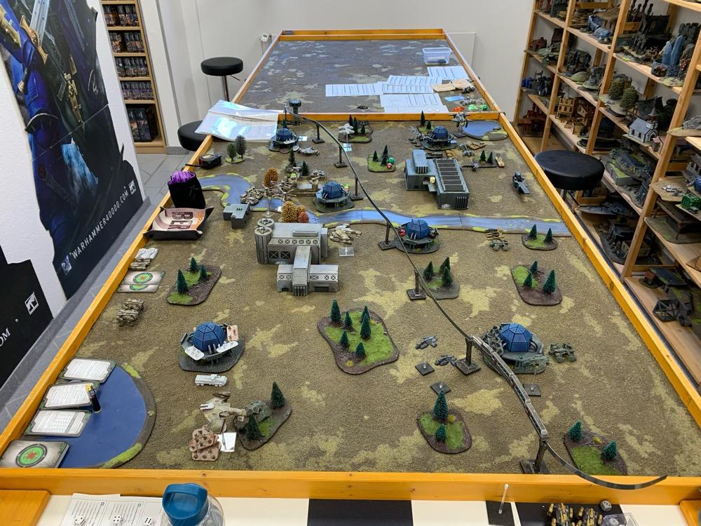 Denyo Geschrieben am 13. April 2024 Autor Geschrieben am 13. April 2024 (bearbeitet) Moving Target - UCM Training Mission „Aaachtung, stillgestanden!“ Die versammelten Offiziere nahmen Haltung an. Generalleutnant Auclair betrat den Raum mitsamt seines Stabs. „Rühren Sie sich, Herrschaften! Fangen wir gleich an. Major Urimov wird Sie in die heutige Trainingsmission einweisen. Major, legen Sie los.“ “Danke Herr General. Wir üben heute den schnellen Zugriff auf ein mobiles Ziel und dessen Exraktion, bei gleichzeitigem Vorstoß in den umliegenden Raum, um das Gebiet zu sichern. Wir bedienen uns hierbei einer lokalen Zuglinie. Ihr Auftrag wird es sein, mich aus dem Zug zu eskortieren und parallel die vier Zugänge zum U-Bahnnetz zu sichern für den Fall, dass die Extraktion unterirdisch erfolgen muss. Fragen?“ Es gab keine. Auclair trat wieder nach vorne. „Danke Major. Dann mal viel Erfolg. Der siegreiche Verband erhält übrigens ein freies Wochenende bei gleichzeitiger Aufhebung des Alkoholverbots. Das sollte für ein wenig zusätzliche Motivation sorgen. Wegtreten!“ Red Team (Denyo) - UCM 1500pts : 1500pts Spoiler HQ Battlegroup 1 1 X Kodiak Command ACV 190pts + CV3 Commander 65pts Chosen Transports and Auxiliary Units: 1 X Condor Dropship 30pts Frontline Battlegroup 1 3 X Praetorian Spec-Ops 120pts Chosen Transports and Auxiliary Units: 3 X Badger Buggy 30pts 1 X Vulture Dropship 35pts + AA Battery 10pts Frontline Battlegroup 2 2 X Legionnaires 40pts 2 X Legionnaires 40pts Chosen Transports and Auxiliary Units: 1 X Raven Light Troopship 25pts 1 X Raven Light Troopship 25pts Armour Battlegroup 1 4 X Polecat Buggy 100pts 1 X Broadsword Super Heavy Tank 85pts Chosen Transports and Auxiliary Units: 1 X Vulture Dropship 25pts 1 X Condor Dropship 30pts Armour Battlegroup 2 3 X Katana Light Tank 105pts 1 X Broadsword Super Heavy Tank 85pts Chosen Transports and Auxiliary Units: 1 X Condor Dropship 30pts 1 X Condor Dropship 30pts Vanguard Battlegroup 1 2 X Praetorian Sniper Team 70pts 3 X Rapier AA Tank 120pts Chosen Transports and Auxiliary Units: 1 X Condor Dropship 30pts Vanguard Battlegroup 2 3 X Rapier AA Tank 120pts 4 X Wolverine Scout Buggy 80pts Chosen Transports and Auxiliary Units: 1 X Condor Dropship 30pts 1 X Vulture Dropship 25pt Auxiliary Group 6 X Condor Dropship 180pts 3 X Badger Buggy 30pts 1 X Vulture Dropship 35pts + AA Battery 10pts 2 X Raven Light Troopship 50pts 2 X Vulture Dropship 50pts Team Blue (Malte) - UCM 1490pts : 1500pts Spoiler HQ Battlegroup 1 1 X Kodiak Command ACV 160pts + CV2 Commander 35pts Frontline Battlegroup 1 2 X Praetorian Spec-Ops 80pts 2 X Praetorian Spec-Ops 80pts Chosen Transports and Auxiliary Units: 1 X Raven Light Troopship 25pts 1 X Raven Light Troopship 25pts Frontline Battlegroup 2 2 X Legionnaires 40pts 2 X Legionnaires 40pts Chosen Transports and Auxiliary Units: 1 X Vulture Troopship 45pts + AA Battery 10pts Armour Battlegroup 1 3 X Katana Light Tank 105pts 1 X Broadsword Super Heavy Tank 85pts 3 X Rapier AA Tank 120pts Chosen Transports and Auxiliary Units: 1 X Albatross Heavy Dropship 60pts Vanguard Battlegroup 1 4 X Falcon Light Gunship 180pts + AP Multi-Missile 5pts + AA Multi-Missile 5pts 3 X EAA Columbus Battlewalker 210pts + Heavy Flamethrower 0pts 2 X Praetorian Sniper Team 70pts Vanguard Battlegroup 2 2 X Praetorian Sniper Team 70pts 2 X Longbow Howitzer 60pts Chosen Transports and Auxiliary Units: 1 X Vulture Dropship 35pts + AA Battery 10pts Auxiliary Group 2 X Raven Light Troopship 50pts 1 X Vulture Troopship 45pts + AA Battery 10pts 1 X Albatross Heavy Dropship 60pts 1 X Vulture Dropship 35pts + AA Battery 10pts Das Spiel Bei bestem Wetter treffen die beiden Verbände aufeinander. Der zum Manöverraum auserkorene Raum wurde geräumt, sodass auf Zivilisten keine Rücksicht genommen werden muss. Team Red gewinnt die Initiative und die Truppen werden eingeflogen. Vorab hatten bereits die Scharfschützen beider Seiten Stellung bezogen, sodass klar war, dass es kaum Versteckmöglichkeiten geben würde. Team Red bringt je eine Armour Group auf die Flanken, mit dem Ziel, beide naheliegenden UBahn Eingängen zu sichern. Auf der linken Flanke kann ein gelandeter Broadsword-Panzer auf den gegnerischen Kommandanten anlegen, welcher sich unvorsichtigerweise am Straßenrand und damit weitgehend im Freien positioniert hatte. Leider würfelt mein Broadsword eine Eins beim Verwunden … (das sollte übrigens gerade so weiter gehen. Meine zwei Broadswords und mein Kodiak schalten im gesamten Spiel keine Modelle aus…) Aber auch auf der rechten Flanke läuft es nicht. Meine AA Panzer werden durch landende Kampfläufer überrascht und ausgelöscht. Immerhin im Zentrum kann ich fix den Bahnhof mit Infanterie besetzen und den Major vom Feld eskortierten (2 Siegpunkte) Nachdem aber meine Anti-Panzerwaffen völlig versagen und vom gegnerischen Broadsword nieder gemacht werden und auch die Luftabwehr ausgeschaltet wird, kann ich nichts tun, um Team Blue von der Einnahme der sekundären Missionsziele abzuhalten. Malte gewinnt verdient mit 3:2 und damit haben sich seine Soldaten den Wochenendausgang redlich verdient. Bei mir klappte bis auf die super smoothe Extraktion des Hauptmissionsziels gar nichts. Der Kodiak, die zwei Broadsword und die 2 Rapier-AA Squads wurden ohne selbst Schaden zu machen ausgeschaltet. Das habe ich echt verwürfelt, aber auch nicht gut runter gespielt. Und meine Liste war Maltes auch komplett unterlegen. Kann man nichts machen, Spaß hat es dennoch wieder einmal sehr gemacht. Der Tisch sah toll aus und Malte ist ein super Typ! bearbeitet 15. September 2024 von Denyo 3